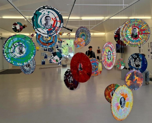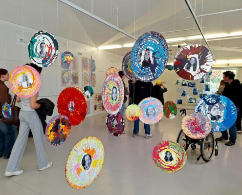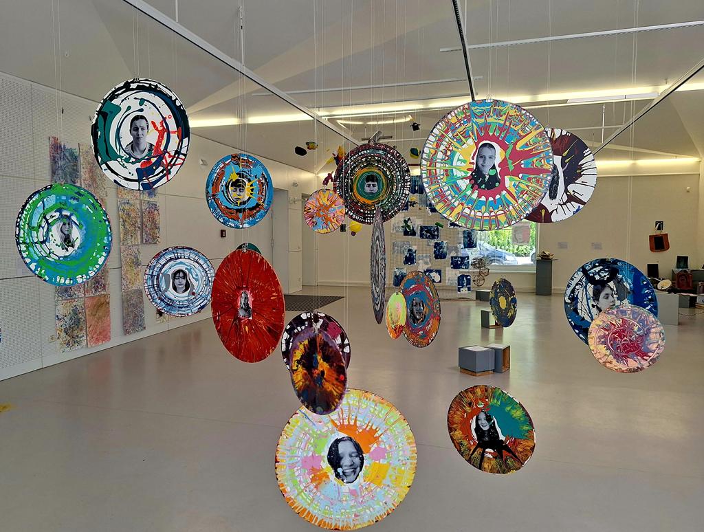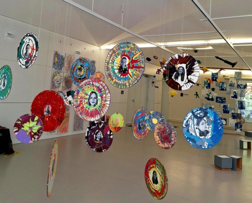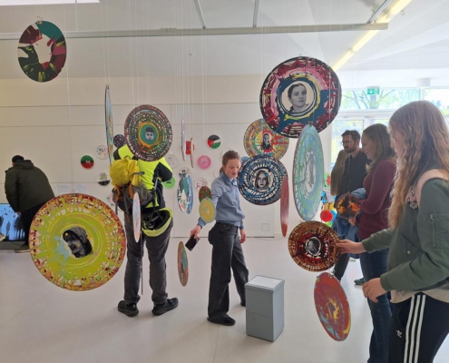 Nachdem die Teilnehmer*innen zuerst mit Farbe und Ausdruck experimentierten, fotografierten sie anschließend in Gruppen ihre eigenen Porträts. Diese wurden dann mittels einer einfachen Transfertechnik auf Holzscheiben übertragen, wobei jede Seite der Scheibe ein Selbstporträt mit einem anderen Ausdruck zeigt.