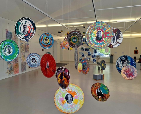 In der Ausstellung werden diese Arbeiten als Rauminstallation gezeigt, die Bilder können somit von beiden Seiten betrachtet werden.