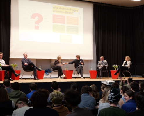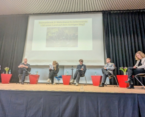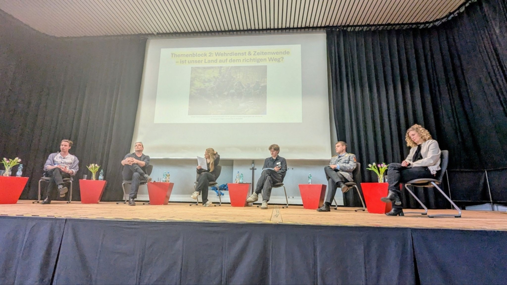 Mit diesen und weiteren Fragen haben wir uns im Rahmen unserer Podiumsdiskussion unter der Leitfrage „Wehrdienst und Zeitenwende – sind wir als Gesellschaft auf dem richtigen Weg?“ befasst. Dazu hatten wir spannende Gäste geladen: Den Journalisten und Autor Artur Weigandt („Für euch würde ich kämpfen“), der jedoch krankheitsbedingt nicht teilnehmen konnte, den Jugendoffizier Mike Siebert, Sascha Braumann von der „Deutsche Friedensgesellschaft – Vereinigte KriegsdienstgegnerInnen“ und schließlich den politische Aktivist und Influencer Simon David Dressler sowie Frau Dr. Friederike Krippner, Direktorin der Evangelischen Akademie Berlin und Mitautorin der neuen EKD-Friedensdenkschrift.